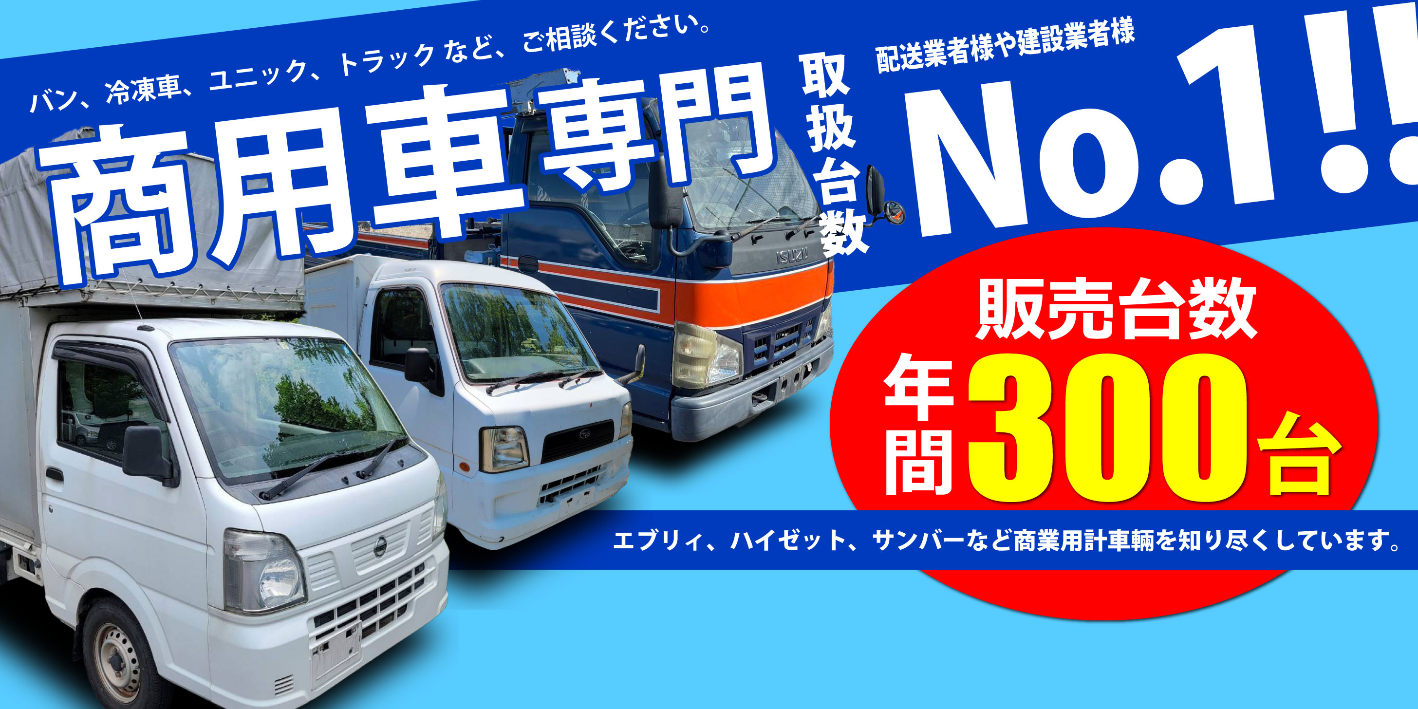商用車専用で売買をしているため、軽バン、軽トラ、冷凍冷蔵車、ユニックなどを含む業者向けの特殊車両も買取致します。お気軽に下取りのお見積りをご依頼下さい。また、お探しの特殊車輌がございましたら、ぜひご相談下さい。専用で売買をしているため、軽バン、軽トラ、冷凍冷蔵車、ユニックなどを含む業者向けの特殊車両も買取致します。お気軽に下取りのお見積りをご依頼下さい。また、お探しのお車がございましたら、車種は問いません、ぜひご相談下さい。